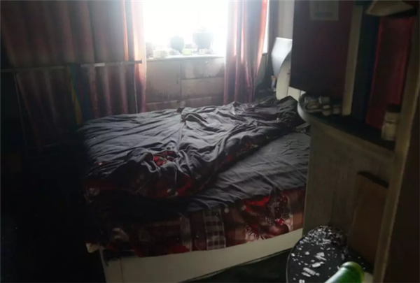 除了客厅,还有一间卧室内的墙壁、橱柜、被褥等也被大火“熏黑”。