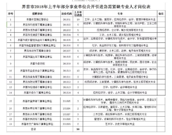 为补充我市部分事业单位急需紧缺专业技术人才,加强人才队伍建设,根据《安徽省事业单位公开招聘人员暂行办法》《关于进一步做好艰苦边远地区县乡事业单位公开招聘工作的实施意见》《界首市关于进一步加强人才工作的意见(试行)》《界首市高层次人才引进办法(试行)》等文件,结合我市部分事业单位2018年人才需求,经市人事人才工作领导小组会议研究同意,面向社会为部分事业单位公开引进一批急需紧缺专业人才。现将有关事项公告如下: