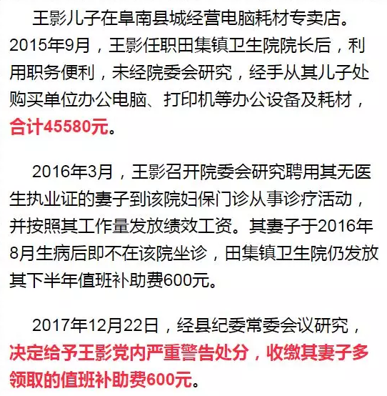 昨日,阜南县纪委通报了4起党员干部特权思想、特权现象典型案例,具体信息如下。曹集镇卫生院镜湖村卫生室原主任张保德违规虚报套取公共卫生经费等问题2009年至2016年,时任镜湖村卫生室主任张保德私自聘用