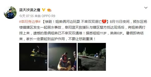痛心无比!昨夜阜阳一对姐弟因溺水身亡!姐姐11岁,弟弟6岁!据@阜阳蓝天沙漠之鹰 的消息8月15日夜间颍东区杨楼镇辖区发生一起溺水事故阜阳蓝天救援队与辖区警方抵达现场后将落水的姐弟俩打捞上来